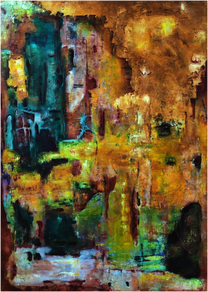 Strange painting. Don’t know what to think of it, yet. But it surprises me. And that’s what I always tell my students: “Surprise Yourself!” So that’s probably a good thing.